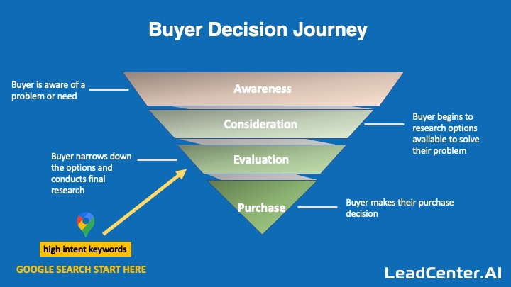 2. Search in general is more important than other channels because of the high purchase. To understand that term we need to look at something called the buyer decision journey or the consumer decision journey. So, the consumer goes through a funnel before they decide to buy. In that funnel, they first go into an awareness stage where buyers are aware of the problem or need. Then they go into a consideration stage where buyer begins to research options available to solve their problem. Then they go into evaluation down the funnel where buyers narrow down the options and conduct final research. Then the buyer will decide to buy. One of the great things about search engines is that the buyer enters immediately the evaluation stage. If you are trying a direct ranking strategy for high intent keywords like financial advisor near me retirement planning or the services that your practice offer directly, this is where google search fits. So, it starts here, and it makes it faster for you to convert that lead to an actual business.